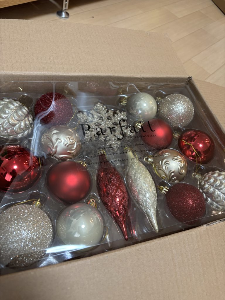 私が購入したのは、ゴールドやブロンズ系の落ち着いた色味のボールや、透かし彫りのような繊細なデザインが入ったセット。 これが、アルザスツリーの深い緑色と相性抜群なんです💕