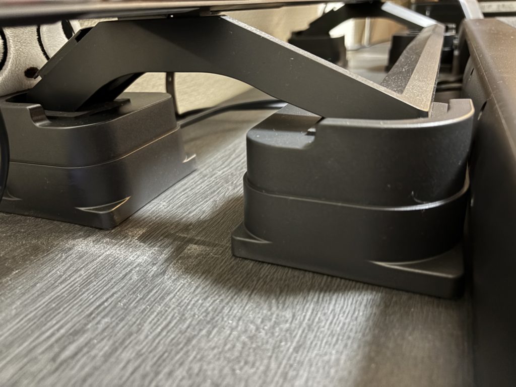我が家のテレビ(50E6800)は受光部が画面下。サウンドバーを前置きすると確実に受光部が覆われ、リモコンが反応しづらいのは目に見えていました。必要クリアランスを測ると、約5〜6cmのかさ上げで解決できそう。色々検索するうちにこちらの足台を発見しました。四隅に設置して、テレビ全体を持ち上げる作戦に。結論から言うと、受光部はしっかり見える位置になり、リモコンのストレスがゼロに近づきました。副次効果として配線スペースと掃除のしやすさも改善。テレビ下にワイパーが入るようになり、埃問題も軽減しました。